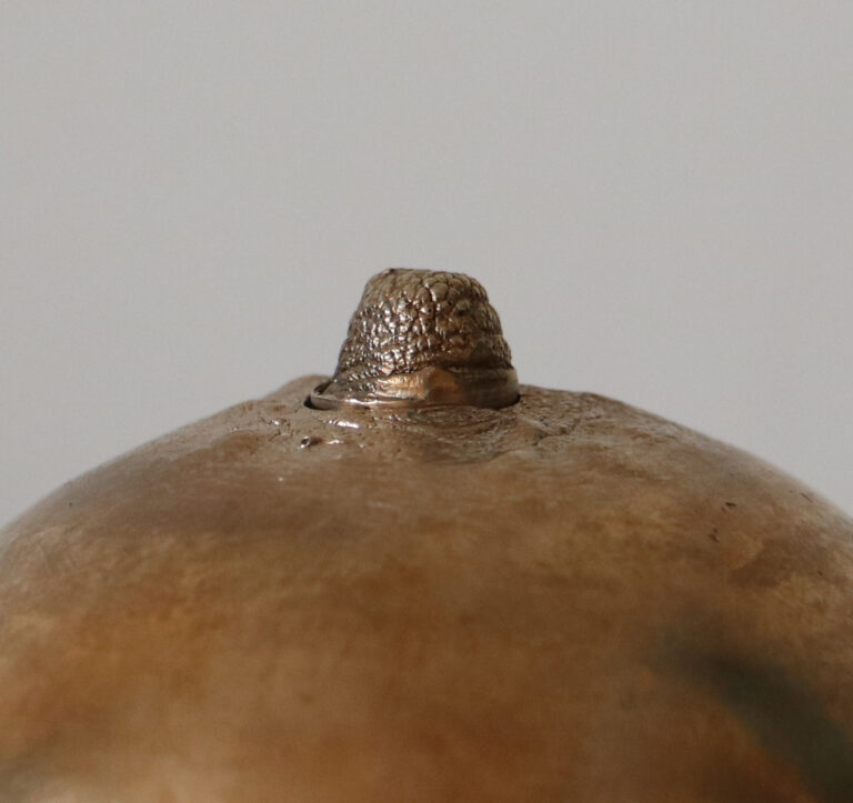 Cast in a material historically associated with monuments, weapons, and endurance, the form oscillates between vulnerability and defense.
